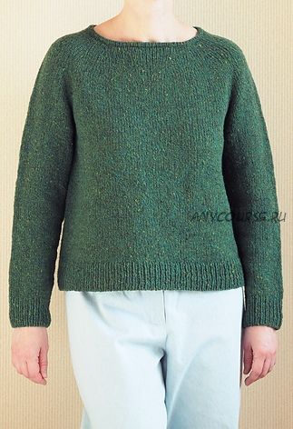 Подойдет любая пряжа, дающая указанную ниже плотность при вязании по кругу, на полотне из которой не слишком выделяются визуально укороченные ряды, и на которой хорошо выглядит резинка 1 x 1. Зеленый пуловер связан из Brooklyn Tweed Shelter, синий - из Lineapiu Group Babycash.