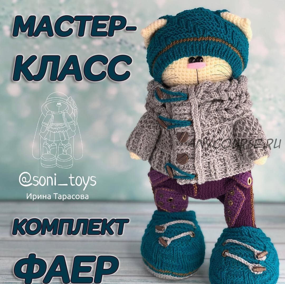 Мастер – класс комплект «Фаер» состоит из 35 страниц в формате PDF, включает в себя около 70 фотографии и описание 5 элементов (шапка, майка, джинсы, джемпер и ботинки) С помощью этого мк вы сможете создать интересный узор из кос и модно одеть своего вязаного котика или зайку (одежда подходит для игрушки ростом 40 см)