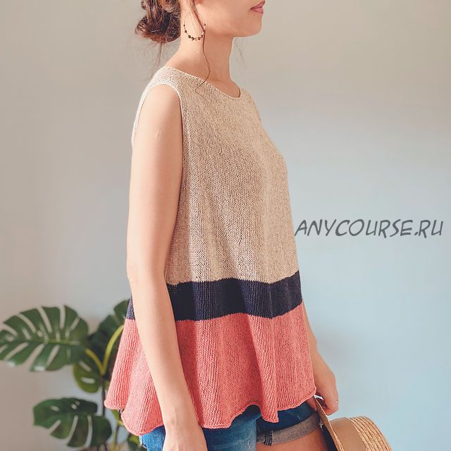 Топ вяжется по кругу сверху вниз с разрезом на спинке. Топ трапециевидной формы, узкий в плечах и расклешенный книзу. Кокетка и корпус топа формируются радиальными прибавлениями. Несколько укороченных рядов выполняются в верхней части для ростка.