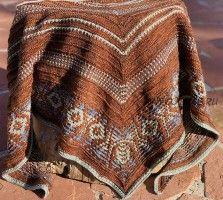 Эта шаль начинается с «платочного язычка» и вяжется сверху вниз в традиционной форме симметричного треугольника. Снятые петли используются в различных техниках для создания текстурно-интересных мотивов повсюду, включая мозаичную кайму.